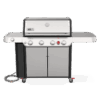Weber Black Genesis Grill includes PureBlu burners with a unique, tapered design, creating a consistent flame and even heat across the grilling surface; Raised flame openings keep food debris falling away, minimizing clogs and corrosion
